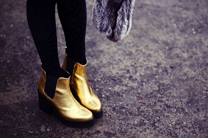 Szaro, buro i ponuro... dlatego nie ma nic lepszego niż takie żarówy na stopach! Moje złote buty Miista po prostu świecą w tych ciemnościach, widać je z daleka i z pewnością nie można przejść obok nich obojętnie. Uwielbiam metaliczne ubrania i dodatki w sezonie jesienno-zimowym, co roku ponownie "zakochuję" się w tym trendzie, by wiosną się odkochać, ależ jestem niestała w uczuciach. :)