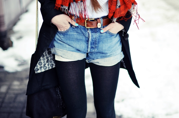 Vintage Levi's shorts | H&M coat | Second-hand scarf | Second-hand belt | Wrangler boots | BagMe bag